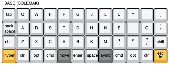 I stuck with a straight copy of Callum’s config for a couple of weeks, and then started to make note of some of the areas that seemed awkward to me. The beauty of this whole system is the ability to use an already established config as a baseline and then adjust and configure it as much as needed. Today, my layout looks like this: