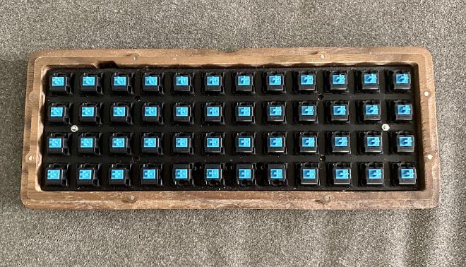 Once everything arrived it was a relatively quick process to put everything together. The Planck PCB sits on the bottom of the case, with some shallow standoffs. Additional standoffs hold the metal plate that the key switches snap into just above the PCB. Screws go up from the bottom of the case to the metal plate, and hold everything tightly together so it feels like a single unit. Next, the switches are pushed down into the plate. Their metal prongs snap into the hot-swappable sockets that were one of the most significant additions to the REV6 boards. Previously switches would need to be soldered in place, and while I’m not against some light soldering it’s exceedingly nice to not have to. Once the switches are snapped in, the keycaps are pushed onto the switch stems, and TA DA the keyboard is assembled!