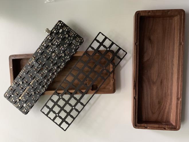 In the meantime I recalled seeing a wooden case somewhere and eventually rediscovered Datamancer. There was a little bit of a lead time for a Planck case, but I went ahead and ordered it anyway. It would still be arriving long before the Planck. I had already been packing my Preonic back and forth from work, so having a case with a lid was going to be a nice addition.